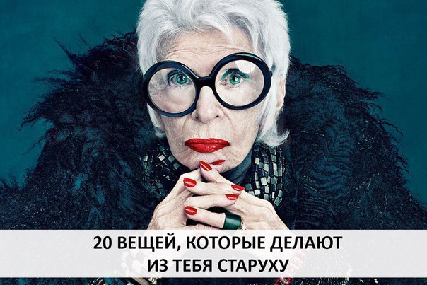 1. 20 ВЕЩЕЙ, КОТОРЫЕ ДЕЛАЮТ ИЗ ТЕБЯ СТАРУХУ1. Сумка в тон туфель и бижутерия в наборе также сегодня крайне неактуальны и автоматически накидывают пару-тройку лет.2. Избегайте оливковых, болотных и прочих землистых тонов, которые Рекомендуем ПОДПИСАТЬСЯ !Показать полностью…рефлексируют на лицо и придают ему нездоровую бледность.3. Приверженность многих женщин к роскошным тканям, таким как бархат, атлас, кружева и люрексы, особенно в дневное время, работает против них.4. Чтобы не выглядеть старше своего возраста, используйте любые светлые и розовато-персиковые тона - они прекрасно освежают цвет лица.5. Что касается черного, то мнение о том, что этот цвет старит, спорно. Ведь нет ничего более манящего, более элегантного, более роскошного, чем женщина в черном. В крайнем случае, всегда можно освежить цвет лица с помощью платка или блузы.6. Форма. Избегайте различных балахонов и прочей одежды, размывающей контуры фигуры. Такие фасоны идут лишь моделям с параметрами 90-60-90.7. Опасайтесь ярких неоновых цветов, популярных в 80-е годы, отдавая предпочтение выразительным сочным оттенкам.8. Выбирайте правильную длину. Большинству женщин идет юбка длиной чуть ниже колена, которая делает любую ногу стройной, а фигуру изящной. Также стройнят удлиненные прямые брюки закрывающие каблук, джемпера с V-вырезом, верх и низ одного цвета.9.Всем известно, что темные цвета делают нас старше и, напротив, светлые молодят.10. То же касается бриллиантов и, что еще хуже, их более доступных аналогов: украшений из страз, стекла и бисера. Желание выглядеть нарядной может сделать вас смешной, но никак не привлекательной. Простота в этом случае – лучший друг.11. Одежда, вышедшая из моды. Нет ничего хуже, когда женщина тащит за собой образ своей юности – яркий макияж из 80-х, объемные плечи из 90-х и т.д. Не обязательно соблюдать все последние тренды, достаточно уловить общие тенденции – длину юбки, силуэт, цветовую гамму, чтобы идти в ногу с модой и выглядеть при этом современно.12. По возможности избегайте таких комплектов в одежде: юбка + жакет, брюки + пиджак, особенно если и верх и ниp имеют одинаковый рисунок. На работу так ходить вполне допустимо, но вот на прогулку или в кафе - не стоит.13. Старайтесь во что бы то ни стало подчеркнуть талию, будь то платье с тонким пояском или широкий ремень, надетый поверх костюма или даже пальто.14. Интенсивный макияж и сложная укладка, неестественный цвет волос молодости не товарищи.15. Ошибочно предположение, что чем ярче краски и изысканнее прическа, тем вы неотразимее. Здоровые блестящие волосы и деликатный макияж, подчеркивающий достоинства вашего лица – вот то, что украсит любую женщину, особенно перешагнувшую определенный рубеж.16. Одежда, не соответствующая возрасту и статусу. Неформальная одежда, рюши и воланы, стилизации под 20 или 30-е годы идут далеко не всем и заставляют окружающих воспринимать вас неадекватно.17. Старайтесь соответствовать своим внешним видом той социальной группе, к которой вы себя относите или хотели бы относить. Преподавателю престижного ВУЗа стоит выбрать сдержанный интеллектуальный шик, а актрисе театра или кино – богемный.18. Выбирайте открытую сексуальную обувь на высоком каблуке. Хорошие туфли любую женщину сделают неотразимой и желанной. И, напротив, грубые закрытые башмаки добавят очарования лишь подростку.19. 
